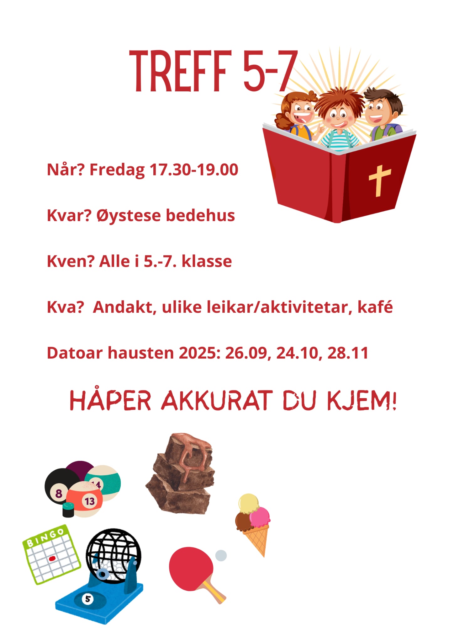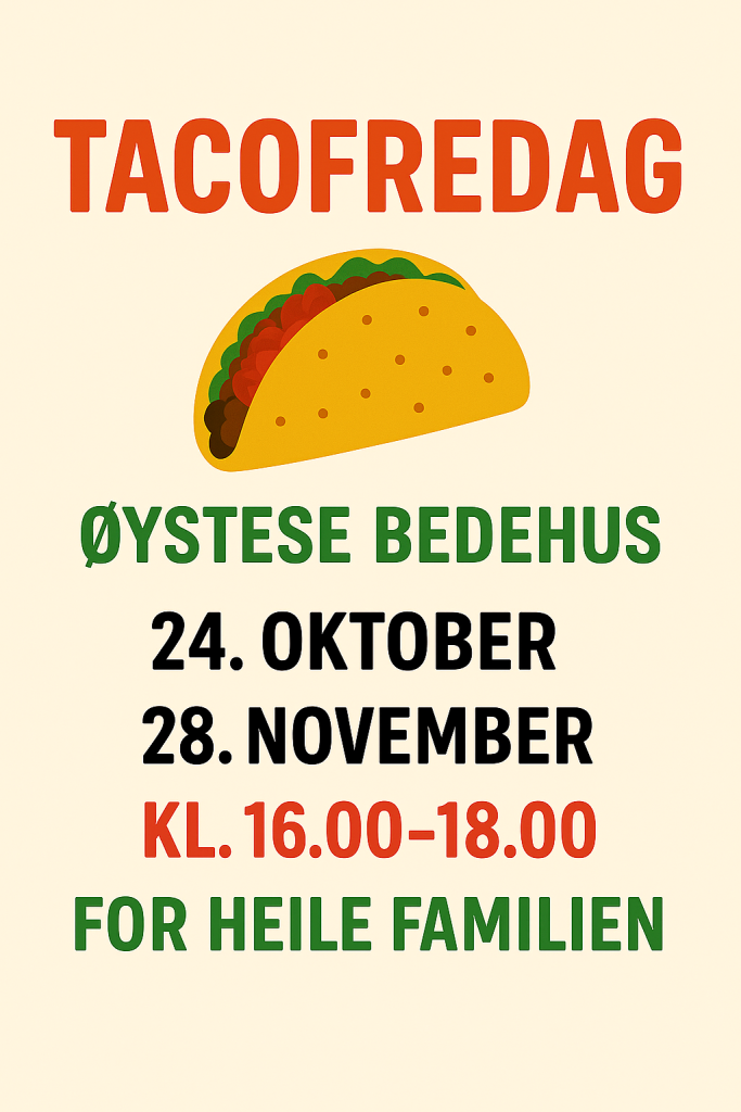 Publisert 19. oktober 2025Ta med familie og venner på TACOFREDAG på bedehuset fredag 24.oktober. Påmelding til Solveig på 98076857 innen onsdag 22.oktober. Pris: 100 kr for voksen og 50 kr for barn. Maks 400 pr familie.