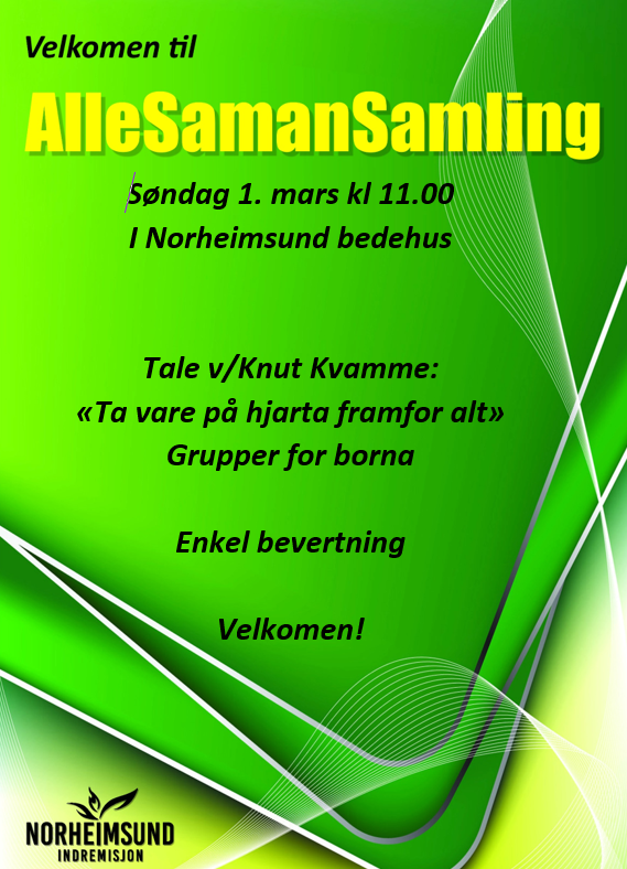På årsmøtet 15. februar vart desse valde inn i styret for Norheimsund Indremisjon: Eli S. Tveitane (leiar), Vidar Grindheim (kasserar), Borghild Tufteland (skrivar), John Sindre Sætrenes, Martin Eikrem, Odd Inge Austevoll (1. vara), Magnus Hisdal (2. vara) og Asbjørn Ljones (3. vara). Guds velsigning over tenesta i styret!